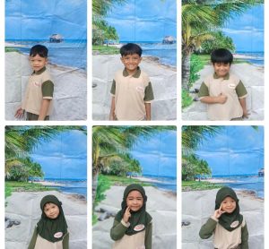 “Yuk, pose di pantai sekarang!” kata Miss Guru. Anak-anak pun kembali berpose di depan spanduk bagian pantai dengan gaya bebas, ada yang bergaya seperti sedang berenang, ada yang pura-pura memegang es krim, dan ada yang berbaring pura-pura santai di pasir pantai.